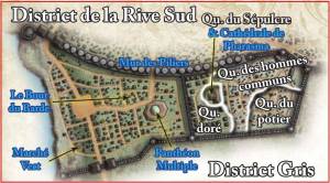 Outre le Marché Vert et le Panthéon Multiple, le district de la Rive Sud est également connu pour le Bout du Barde, une auberge qui accueille bardes, acteurs et autres artistes venus de loin, et le Cercle de Jade, qui sert à la fois de salon de thé huppé le jour et de cercle privé la nuit pour les nobles.