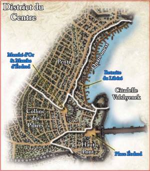 Quand on évoque Korvosa, c’est à ce district cosmopolite et accueillant que la plupart des gens pensent. En tant que district abritant à la fois la Garde de Korvosa et la Compagnie du Sable, le Centre possède le plus petit nombre de gangs (bien que les voleurs y exercent souvent leur art, vu le nombre important de marchands, d’échoppes et d’autres lieux importants au niveau commercial ou financier). Le district du Centre (parfois aussi appelé “District Médian”), est divisé en 5 quartiers.