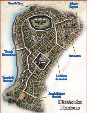 Situé au sommet de la Colline de la Citadelle, ce district offre une vue d’en haut du reste de la ville, tant au sens propre qu’au figuré. La plupart des personnages importants (y compris les monarques) résident dans ce district. Deux enclaves se trouvent à l’intérieur de ce district, sans toutefois faire vraiment partie des Hauteurs : le Château Korvosa et l’Académie.